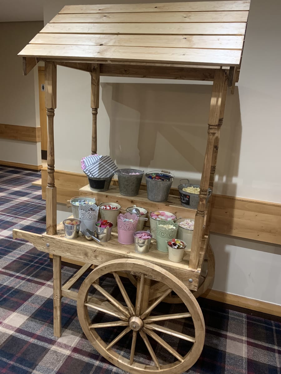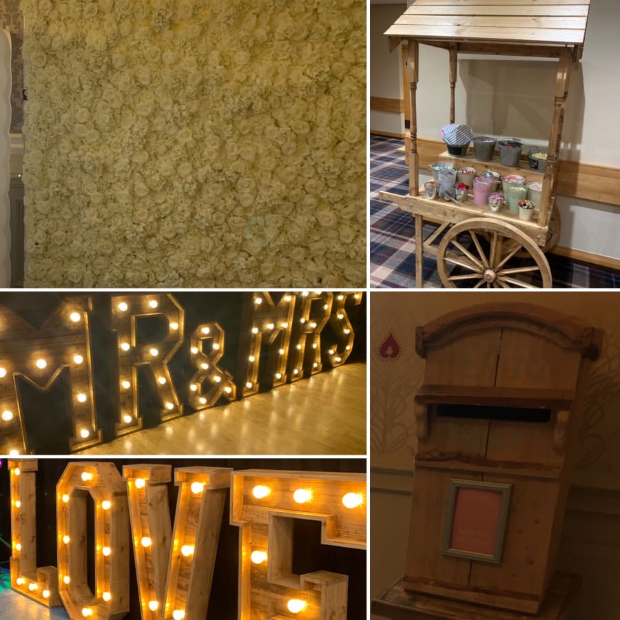 8ft by 8ft Luxury Hydrangea Flower Wall Rustic Candy cart with sweets & bags for 100 guests (-£50 if you wish to provide your own sweets, jars & Bags) Rustic Lockable Postbox to keep your cards safe. Rustic LED illuminated letters of your choice. (LOVE, MR & MRS, MRS & MRS, MR & MR)